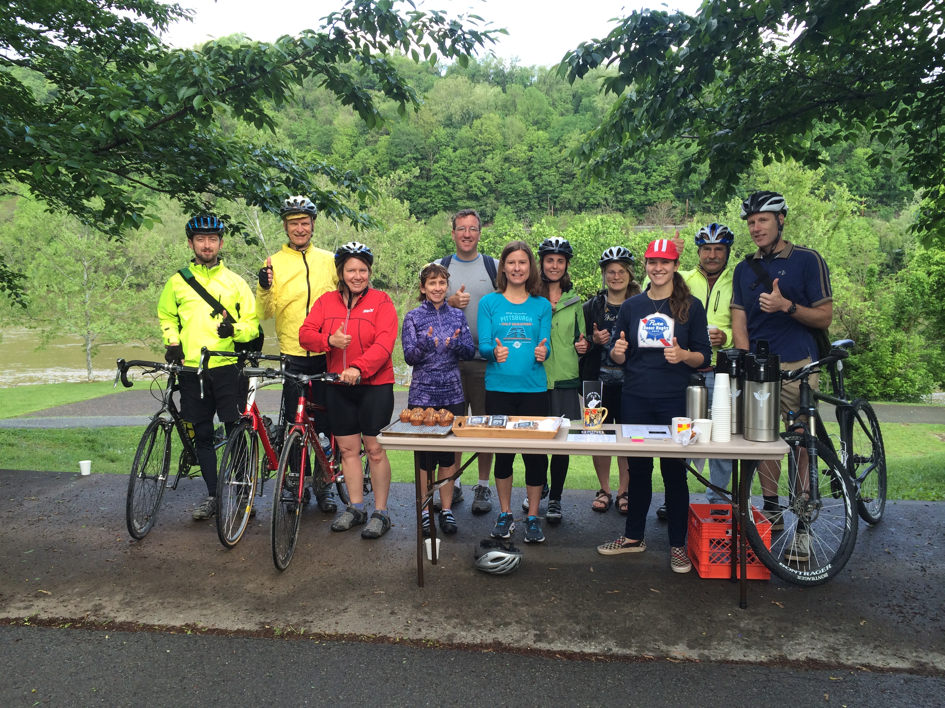 Thanks, Emily for organizing the most successful Bike To Work day the Bicycle Board has ever had! You did a tremendous amount of work getting everything set up and perfectly so: 12 participants including Mayor Selin Coffee, muffins, granola bars, table, server (thanks, Maggie!) from the Grind Free beer tickets from Black Bear Gift certificate raffle from Real that Colleen Harshberger won in drawing performed by Mayor Selin Safe ride out the trail to Sixth St., up Beechurst & Mon Blvd. and across the Evansdale campus. Great Bike Board spirit!