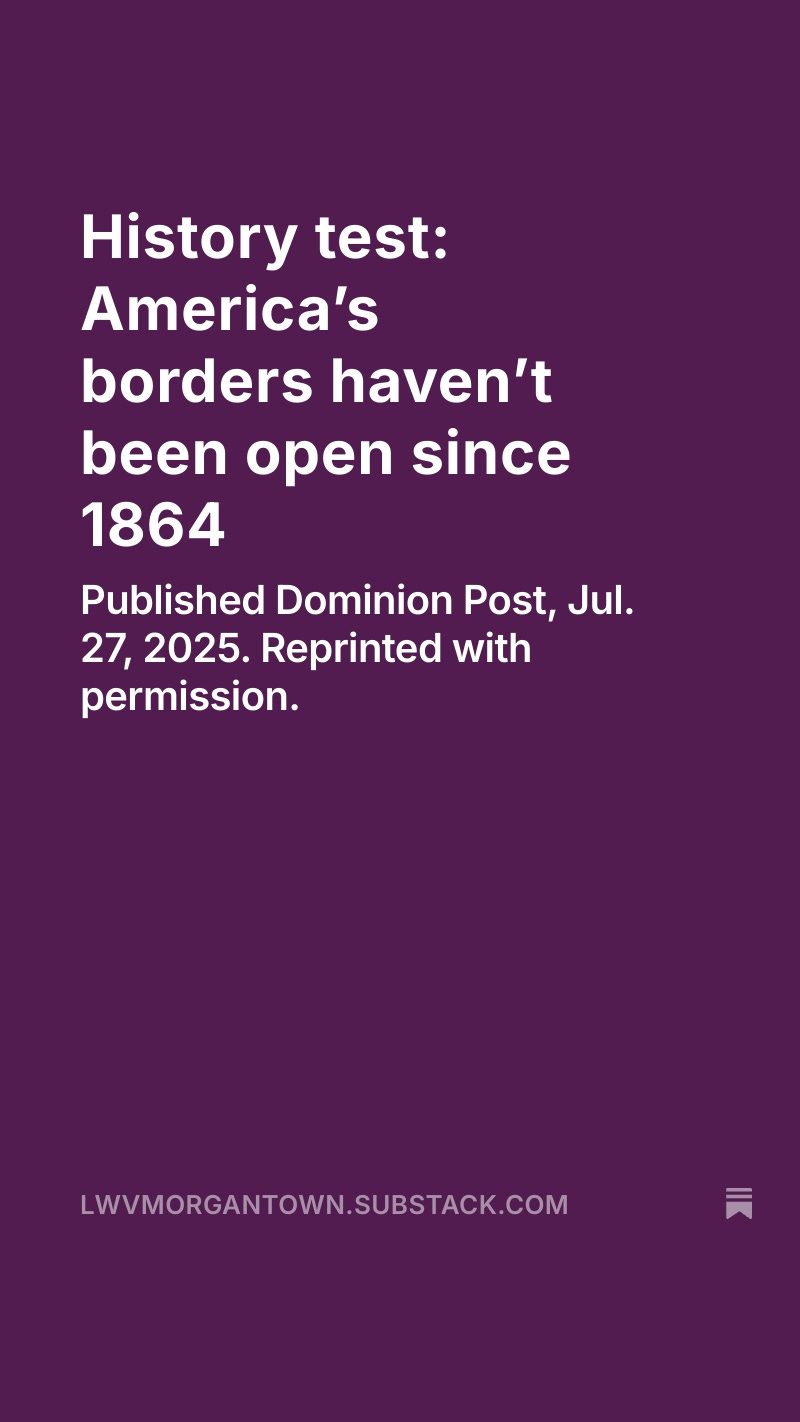 Check out the new Substack post from LWV-MM. We believe it's time to learn some real history about immigration to the United States. Part 1 of 2. https://lwvmorgantown.substack.com/p/history-test-americas-borders-havent